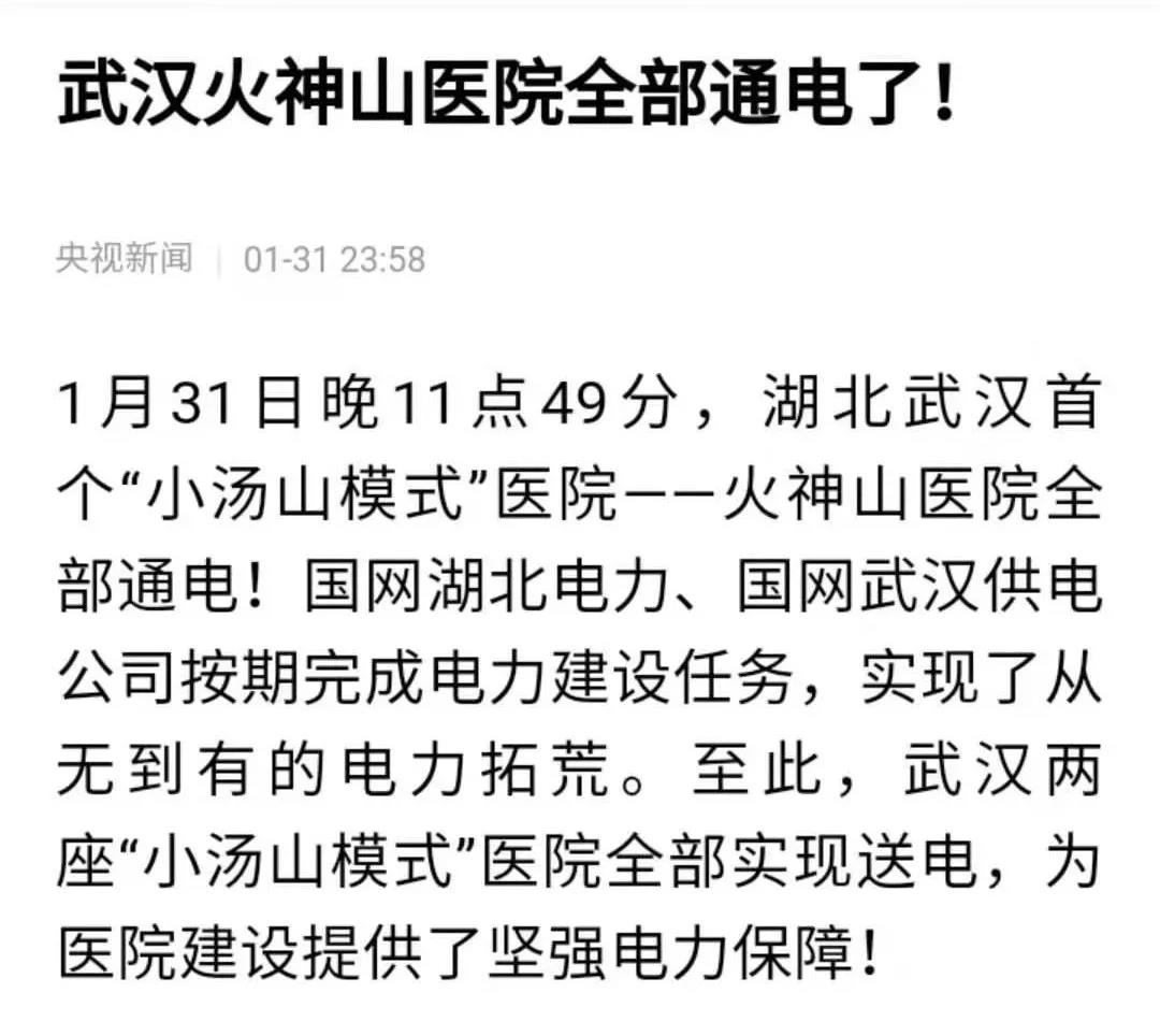 世人拾柴,点亮火神山。1月31日晚11点49分,湖北武汉首个“小汤山模式”病院火神山病院全数通电。 |